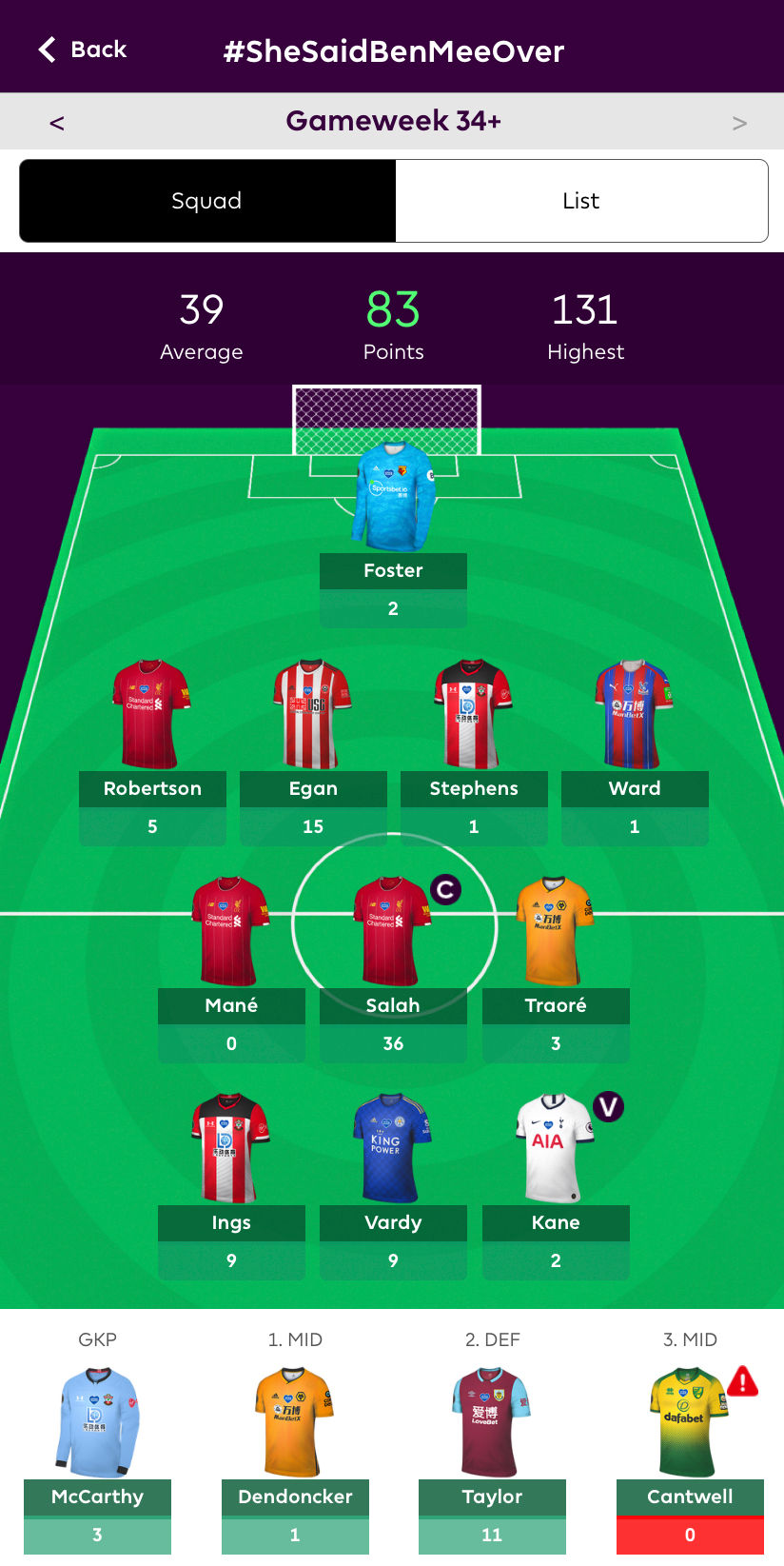 Two of Thursday's three games had no hindrance on my points total, but those games still have to be mentioned. Bournemouth and Spurs honestly produced one of the worst games I have seen, and I am not exaggerating believe me. I had that game on the television, but I was frequently to having my attention diverted to the match on my laptop. In a game that was mainly end-to-end at Goodison Park, Everton and Southampton drew 1-1. This was a contest that did matter for me, and Danny Ings opened the scoring, showing his usual persistence and perseverance for a simple finish. More points for me! Jack Stephens was booked, but that was not making a huge difference to the good score I was going to get. Now to end things, the other match that featured none of my players but has to mentioned quickly is Manchester United's 3-0 win at Aston Villa. The penalty decision was a poor one, but then the VAR did not overturn it, as it is perceived that despite it was not a foul, the referee's call was not a clear and obvious error so the penalty stood. It was never a penalty and the FA and the Premier League officials need to sit down and sort things out. The Premier League need to make sure referees watch as many replays as possible pitch-side, because some decisions that have been able to stand and not be overruled this season are shocking. At first Gary Neville on commentary said what Bruno Fernandes did was clever, but if it had been a non-Manchester United player, or a player Neville disliked, I am pretty sure that is not how he would have seen it. Fernandes was the one who ending committing a foul and was of course unpunished. Villa are in the quagmire and things like that can zap all their confidence, after that United were all over them and they had no chance. Right my mini rant is over, but sorry had to squeeze that in.